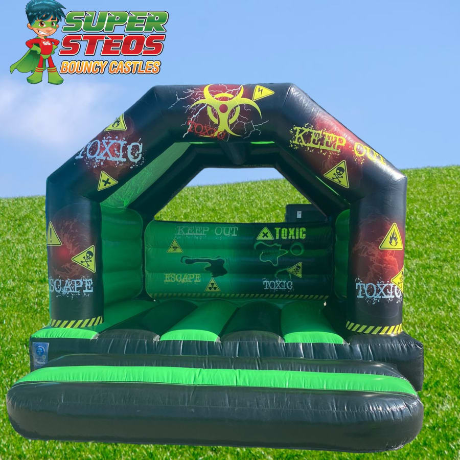 12 ft x 12 ft Toxic Green & Black is a great sized bouncy castle, please don't forget to add 5 ft extra at the back of the inflatable for the blower. Toxic theme seems to be increasing popular for parties the last 2 years but I don't know why.