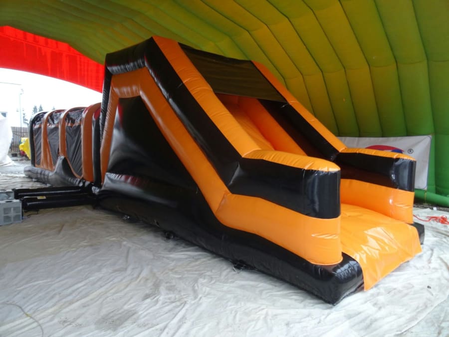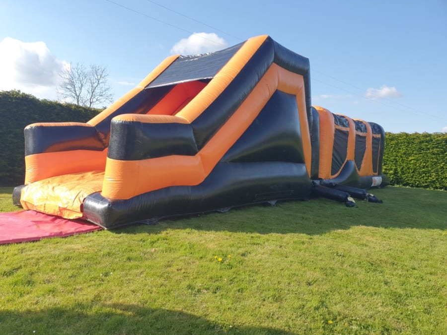 To ensure this bouncy castle is safe to use we do require an extra 2ft in width either side of the unit. So ideally for this 14ft x 41ft Obstacle Course Orange/Black, we would need 19ft feet in width so in order that we can secure and peg it down safely.