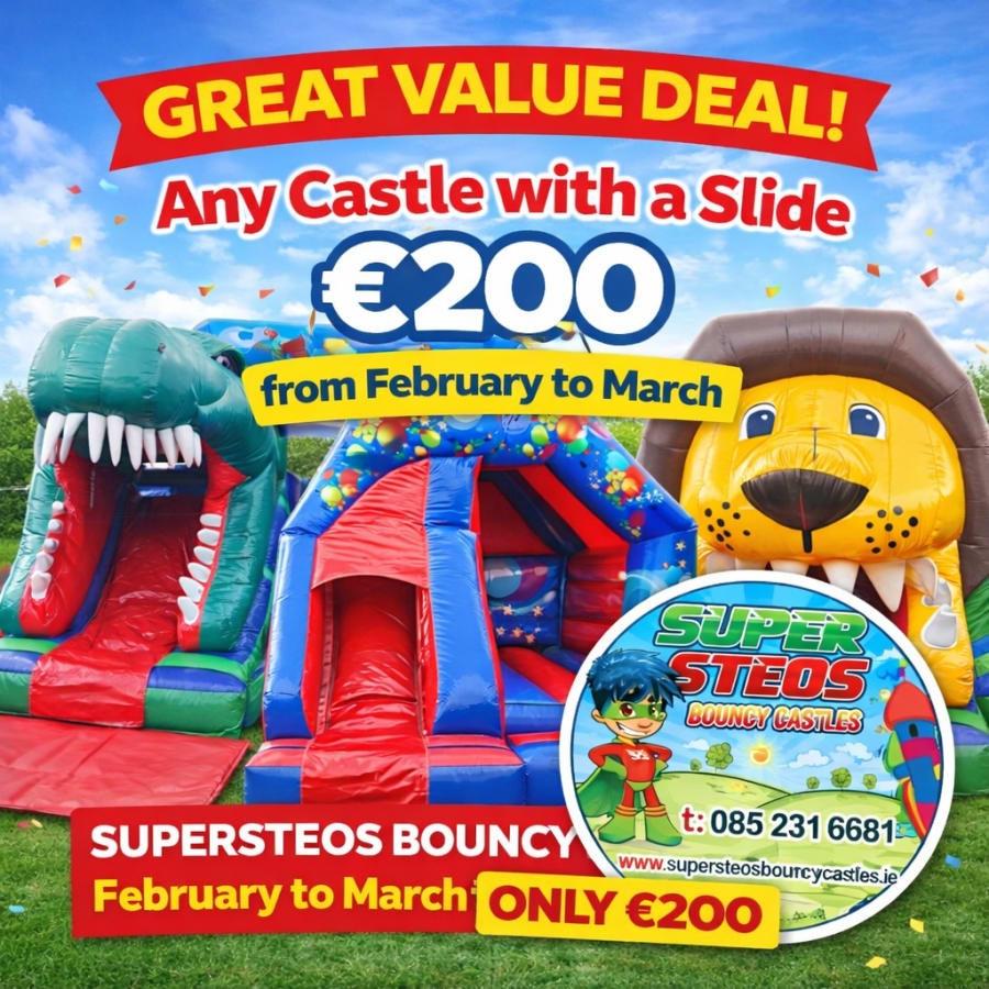 Bouncy castle hire 12x15ft castle with slide WEEKEND DEAL!! FEBUARY AND MARCH ONLY!! in Dublin — Grab the most popular castle with a slide for just €200 from Friday to Monday. Fast. Affordable. Perfect for birthday parties and weekend events. Back garden hire only. Delivery included to Dublin back gardens. π π