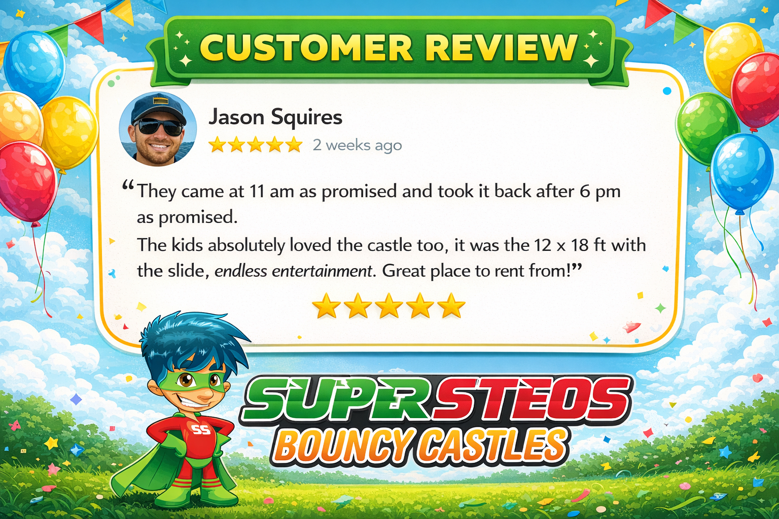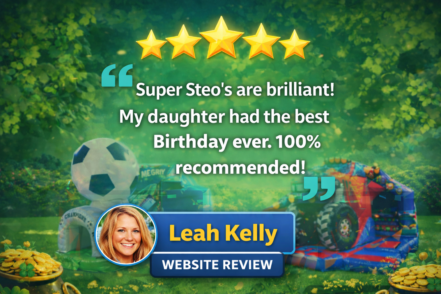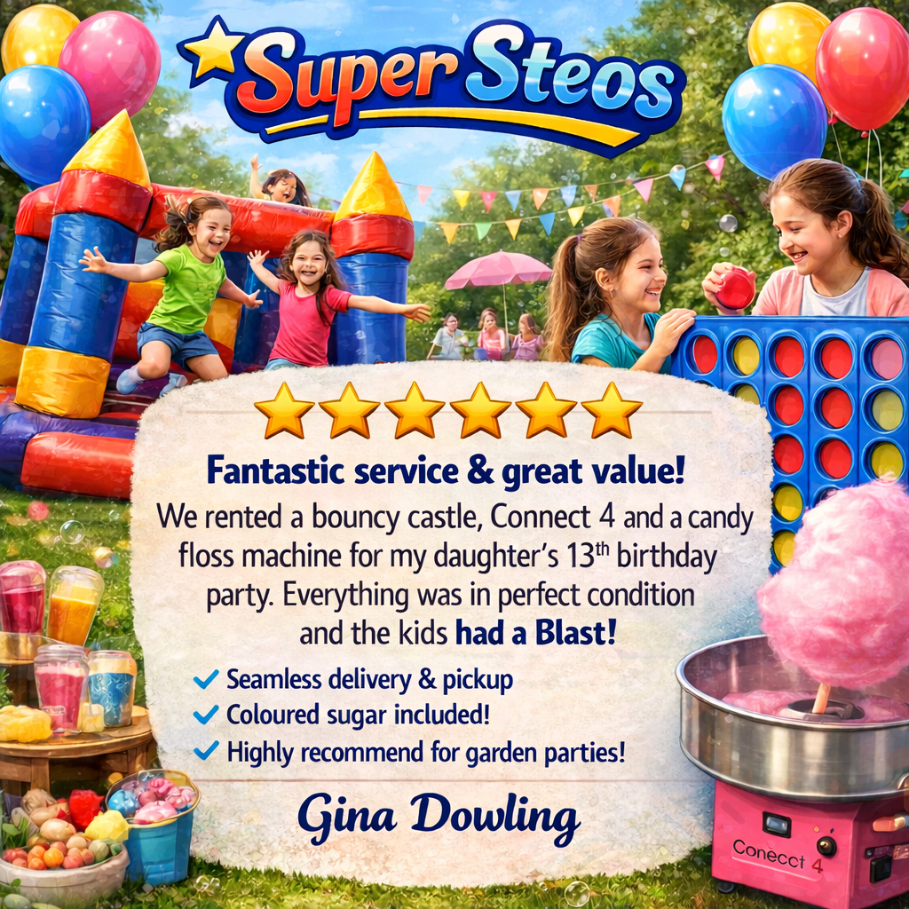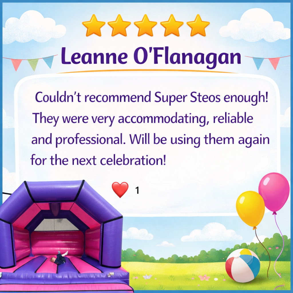 Super Steos we’re very helpful from start to finish. They accommodated a last minute booking of an obstacle course bouncy castle. They let me know when they’d be dropping off and collecting the bouncy castle. They were really efficient at setting up and taking down the castle. Louise was really good to deal with. After a no show with a different company last year we were nervous about trying to book a bouncy castle again but Super Steos were great from start to finish. Would highly recommend!