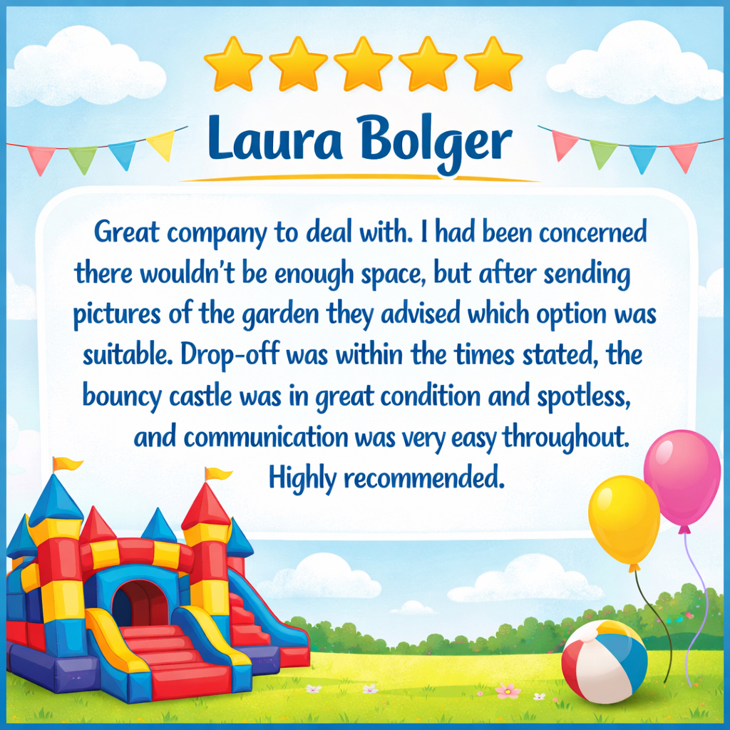 From start to finish the service was excellent. The staff were so friendly. Louise contacted me the morning of to let me know when she was arriving. She did a great job setting up the bouncy castle. The bouncy castle was clean and brilliant quality. The kids had an amazing time on it. They contacted me later that evening to let me know when they were coming to collect it. Overall the perfect service. Thank you.